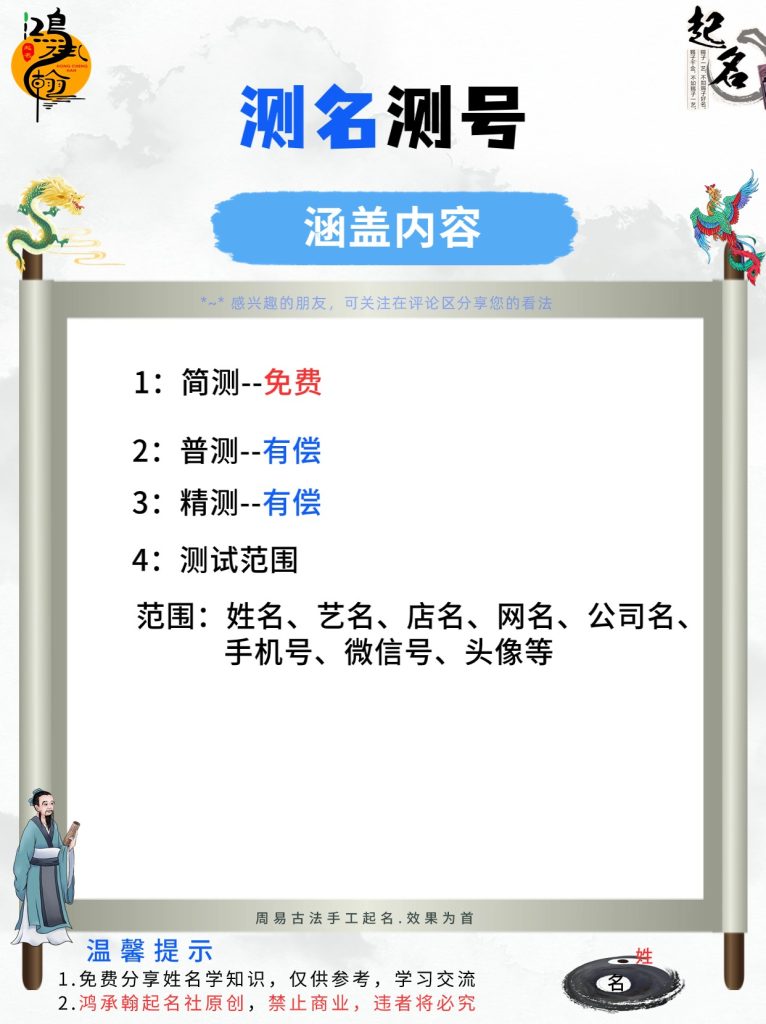 包含:简单测现名、改过的个人名字及艺名;店铺、工作室、公司名、手机号、电话号码、微信头像、车牌号码、八字婚配等,保证专业,不走弯路。