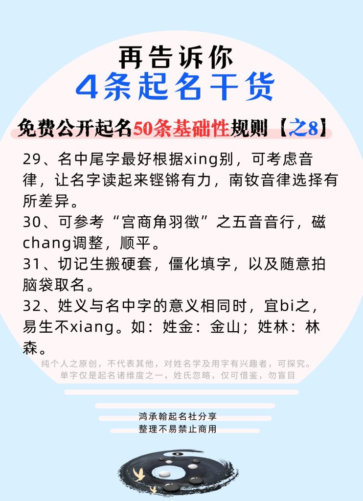 名中尾字最好根据性别,可考虑音律,男女音律选择有所差异。