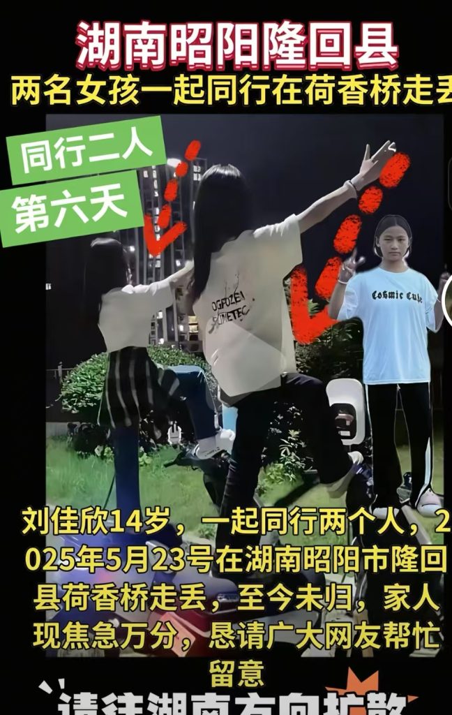 湖南隆回县14岁,初中年龄段的女孩,2025.5.23在其县城里走丢,至今杳无音讯,希望平安归来。