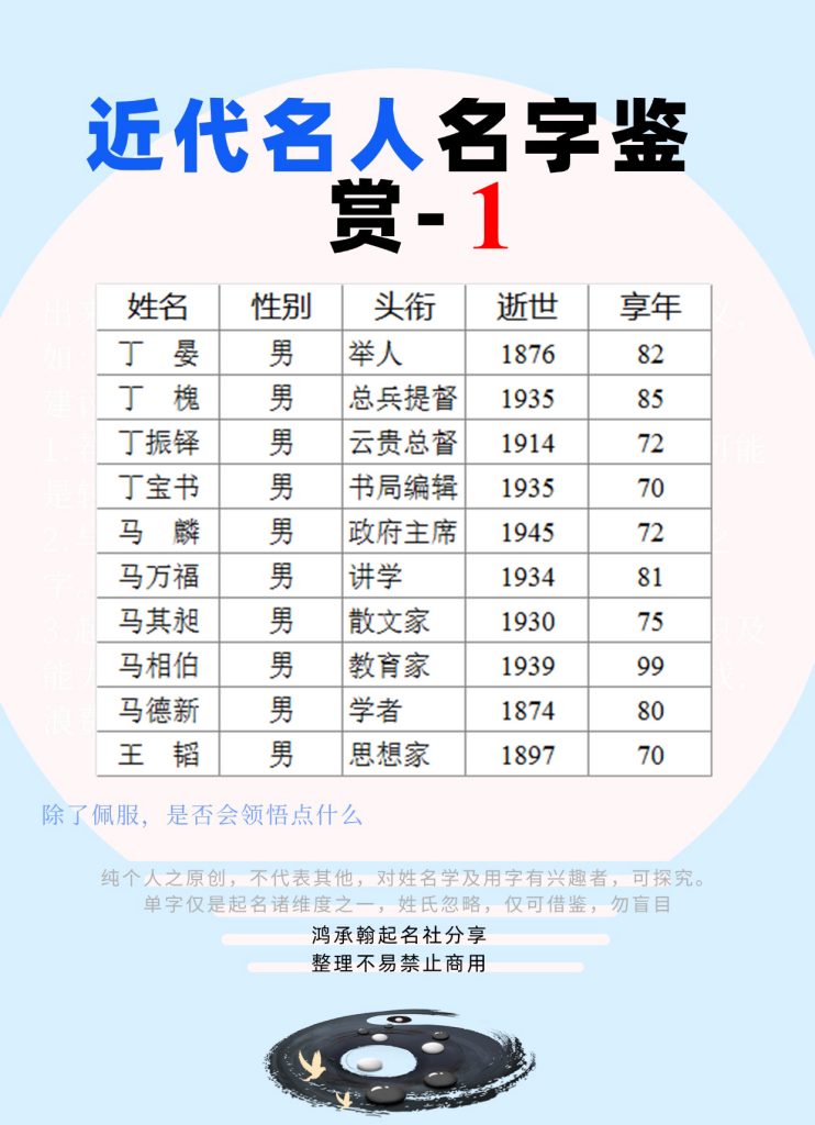丁、马、王三姓名人名字摘要一,来自《近现代名人生平暨生卒年录》,若有兴趣去研究,你会发现,现有的绝大多数姓名学书本及大师们的知识分享基本不靠谱,因为这是真实发生的名人。